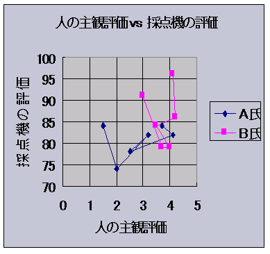 こうしてみると、それほど人間の主観評価と採点機の評価が無関係というわけではなさそうである。もちろん、誤差は大きいが、「機械にオレの気持ちが判ってたまるかぁ!」と怒るほどのことでもないようだ。採点機の評価基準がA氏とB氏の間でも、違いがあるわけではないようだ。
