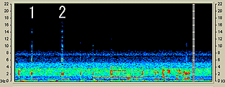 水平軸が時間軸であり、時間は左から右へ流れている。また、縦軸は音の周波数を示している。ここでは、「1」で示したのが家の固定電話の時報であり、少し遅れて「2」の携帯電話の時報が聞こえているのが見てとれる。
