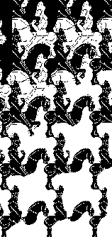 上の版画の一部を(ちょっとだけ細工をしつつ)抜き出してみたのが下の画像だが、白黒半分づつのニ値画像であることがわかるだろう。また、きれいな繰り返しパターンになっていて、平面にこのパターンできれいに埋め尽くすことができるのがわかるだろう。