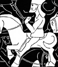 それでは、このhiraxtoneを用いて、ニ値画像を元に作成した多値階調ハーフトーンパターンの一例を次に示してみる。これは、先の"Studyof the Regular Division of the Plane with Horsemen"の一部分を縮小したニ値画像をもとにして処理してみたものである。![]()  | ![]()  |