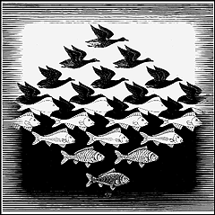 何はともあれ、そんな感じでやっとのこと会場に辿り付いて、いくつかの話を聞いていたのだけれど、その中でもとても面白かったのが、大日本印刷の阿部淑人氏の「シミュレーテッド・アニーリングによるディザマトリックスの最適化」という話だった。色々な項目を適当に重み付けしながら、ハーフトーンパターンを自動で生成して、理想のハーフトーンパターンを作成しよう、というものである。その話の後半では、工芸的なスクリーンの話も俎上に上がり、M.C.Escherの"Sky& Water I"をグラデーションの例に挙げてみたり(残念ながら実際にそんなハーフトーニングをしたわけではないが)、菩薩像を般若心経でハーフトン処理してみせたり、となかなか「できるかな?」心をくすぐるものだった。そこで、私も似たようなことにチャレンジしてみて、さらにはM.C.Escherの版画を使ったハーフトーニングを行ってみたいと思うのである。