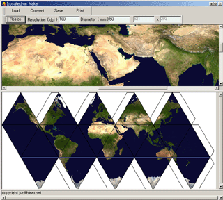 そういえば、一年近く前に「小さな掌に未来の地球儀をのせて」でメルカトル図法の地図画像から正二十面体展開図を作成して、小さな正二十面体の地球儀を出力するソフトウェア"Icosahedron"を作ったことがあった。このソフトとプリンターがあれば、色んな地図から掌に載る小さな地球を作ることができる。そして、自分の掌の上で小さな「夜の地球」を眺めてみることができる。