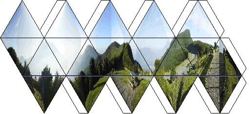 ところで、地球を中心にして地球を全周囲から眺めた様子を二次元に投影したものが地図だけれど、その全く逆のことをしたものがある。それはパノラマ写真である。何故なら、パノラマ写真は「世界の何処か一点を中心として、その点から全周囲を眺めた様子を二次元に投影したもの」であるからだ。つまり、「何処かを周囲から写したものが地図」で「何処かから周囲を写したものがパノラマ写真」であるという違いだけで、その二つはほとんど同じものだ。だから、パノラマ写真を元にして、Icosahedronで正二十面体を作ってみても、ちゃんとした世界ができあがる。