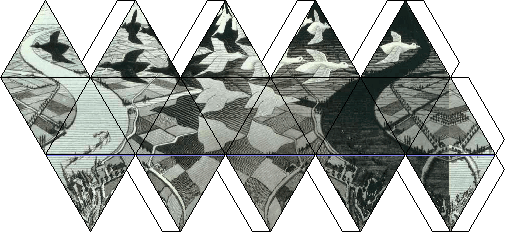 例えば、エッシャーの「夜と昼」を正二十面体の世界に閉じこめてみたのが、下の展開図だ。これを組み立てれば、エッシャーの描いた世界が、エッシャーの描いた「昼と夜」が小さな正二十面体の中から映し出されることになる。これを組み立てた正二十面体を覗いてみれば、不思議なエッシャーの世界を色んな方向から眺めることができるのである。