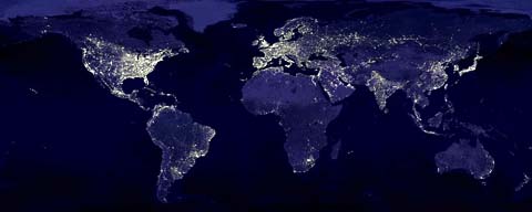 先日、こんな綺麗な画像を教えてもらった。人工衛星(DMSP)から撮影された地球の夜景だ。世界中の色々な街が光り輝いていて、とても美しい景色が見える。この下に貼り付けてある写真はとても小さい写真なのだけれども、オリジナルの写真を眺めていると、色んな国の街の灯が目の前に浮かび上がってくるかのように美しい景色に見える。