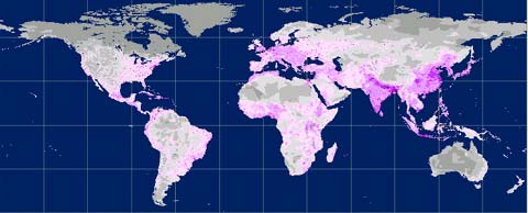 そこで、「世界の人口密度分布」を眺めてみることにした。それが下の世界地図画像である。灰色の地域は人口密度が低くて、白色が中くらいの人口密度で、紫色の地域はとても人口密度の高い地域だ。