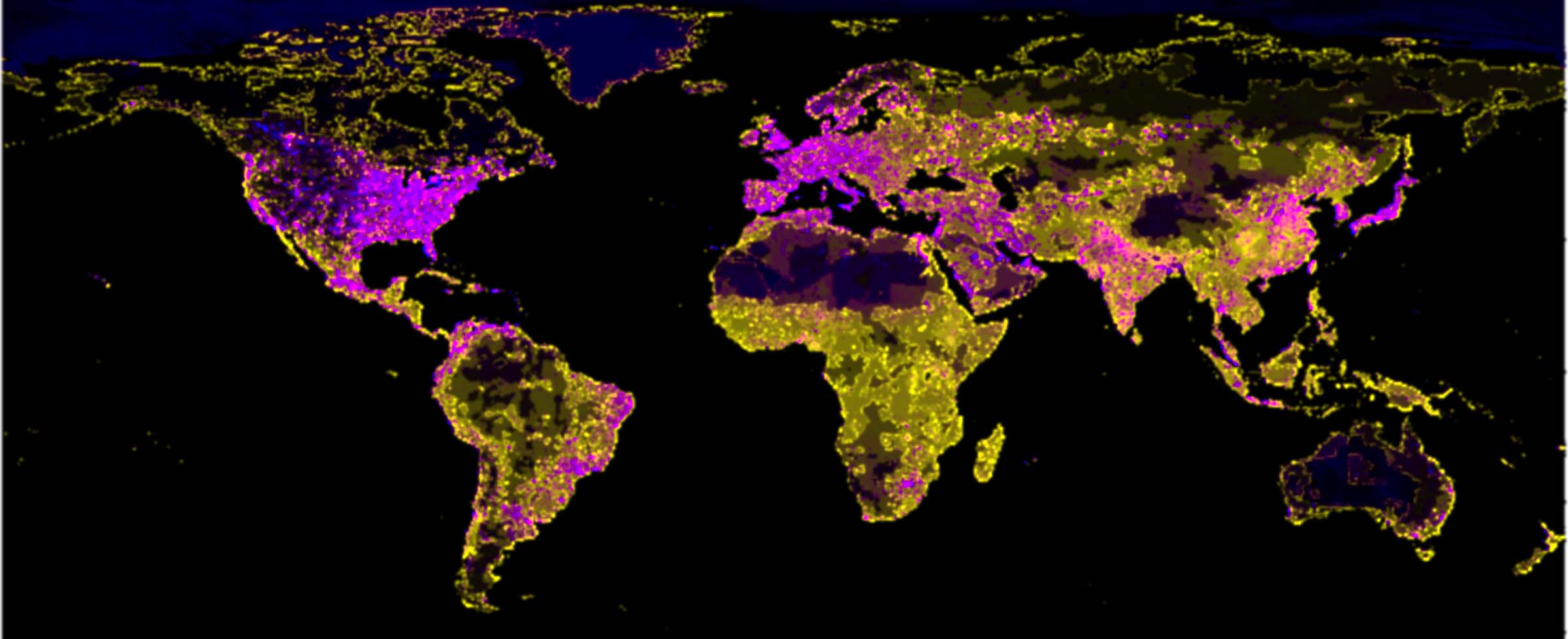 世界地図の中に散らばるそんな地域を目の前に浮かび上がらせるために、最初の画像「人工衛星から撮影された地球の夜景」と「世界の人口密度分布」の二枚の画像を利用して、画像解析により「人口密度に対する夜の街の灯の明るさ」を算出してみた。それが下に示した画像だ。ここで、黄色で示した地域は「人口密度の割に夜の街の灯はとても暗い地域」で、紫色で示した地域は「人口密度は高く、夜の街の灯も輝いている地域」である。