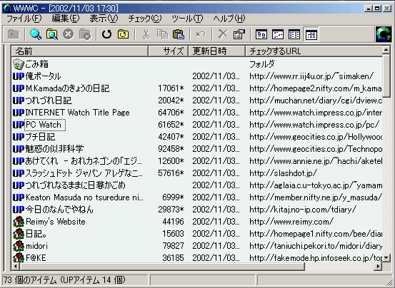 例えば、ワタシはWEBページを読みに行くときにはWebページの更新チェッカであるWWWCを使っている。その動作画面は下に示してみたような感じで、基本的に更新されたサイト名の羅列になる。また、例えばはてなアンテナのような同じような更新チェックアンテナの場合だって、基本的には更新サイトと更新内容がテキストで羅列・表示されることになる。