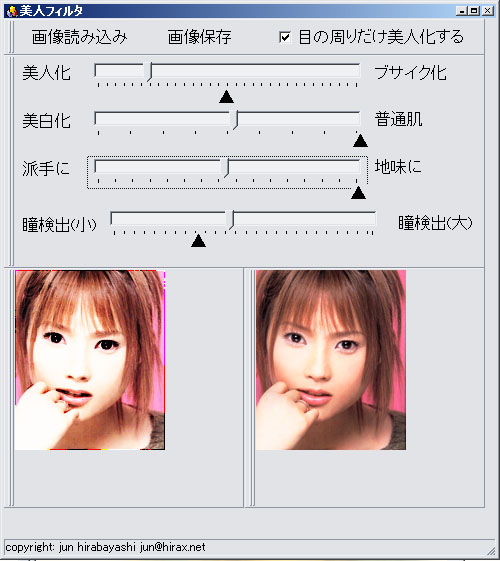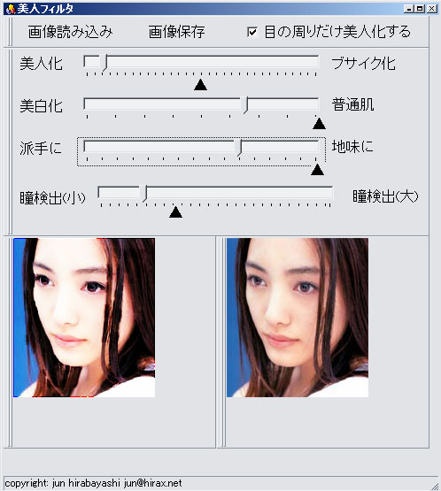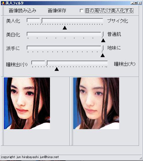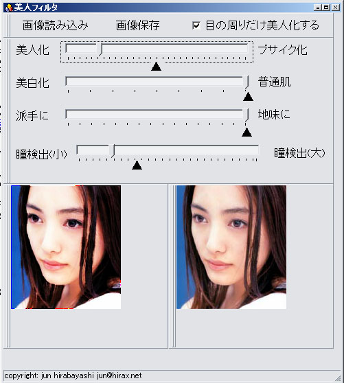 そこで、さっそく作ってみた美人フィルタ(アプリケーションのダウンロードはリンク先から)の動作画面が下の左図だ。今度の「美人フィルタ」は、画像処理で顔の中の部品を抽出し、瞳だけを微分強調することで女性の化粧効果をそのままに再現するという優れものである。実際の処理画面を見てみれば、アプリケーションのウィンドウの中に表示されているオリジナル画像(右)に比べて、美人化処理画像は特に眉毛が太くなることもなく魅力的な黒目がちの瞳が得られていることがよく判るだろう。オリジナルの仲間由紀恵だって十分美人なのだが、左の超美人化「仲間由紀恵」は生きている人間とは思えない程の美人になっていることが判るに違いない。