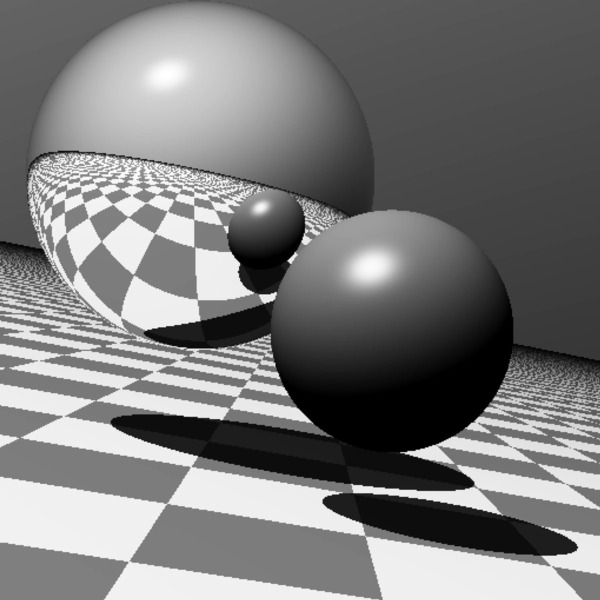 PostScriptはプログラミング言語である。あまりにも、当たり前のことだが、それを意識したのは、1993に開催された『第1回国際邪悪なPostScriptコンテスト(1st International Obfuscated PostScript Contest)』でBest Artwork賞を受賞した、PostScriptでRay Tracingを見た時です。このPostScriptコード(PostScript,PDF)は、右上のような”いかにもレイ・トレーシング”画像を描く。この画像を描きだすPostScriptコードは、信じられないかもしれませんが、小さな小さな(