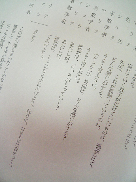 演劇「半神」の中には「1/2+1/2=2/4」という螺旋方程式が出てくる。「1/2+1/2=2/2」ではない。「1/2+1/2=2/4」であって、その答えは割り切らなければならないがために、その結果は「1/2+1/2=2/4=1/2」となる。スフィンクスの問いを踏まえて言えば、その螺旋方程式の答えは「一人+一人=一人」になる。シャム双生児を別れさせたならば、その結果は一人だけしか生き残ることはできないということ。あるいは、DNAの二重螺旋の二本の鎖がいくら絡み合っても、結局のところ決して交わらないということ。だけど、やはりそれでも左辺のように足し算をしたくなるということ。そういった色んなことを示しているようにも見える。もっと、シンプルに言ってしまえば、いやそれが「1/2+1/2=2/4」という数式になるのか。