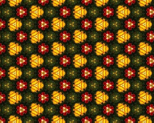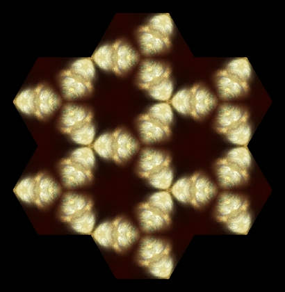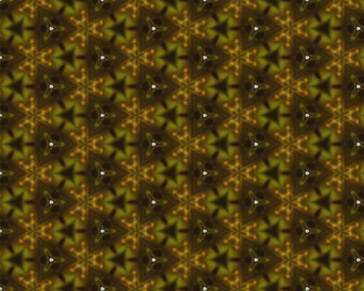 結構綺麗な画像が生成されるので、表示中の画面を(平面を埋めるように並べ)壁紙にする機能も加えてみました。「終了」「画像出力」「壁紙設定」などは「右クリックで表示されるメニュー」から選ぶようにしてあります。いっそのこと、「Flickr から適当な写真を色々取ってきて、万華鏡の世界に飾っておく」なんていう機能を加えてみても、面白いかもしれませんね。