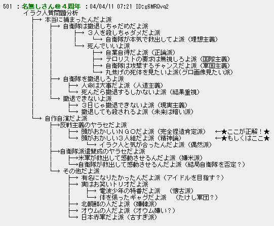 イラク人質問題をツリー構造で分析。(内容については別問題だと誤解無きように書いた上で)これはこれで、なかなか面白いデータマイニング。 from KLaxon - O.P. on HATENA.