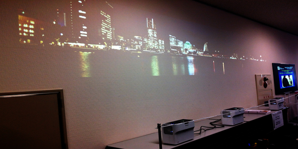 東工大すずかけ台キャンパス(旧 長津田キャンパス)に行くと、横浜みなとみらいのパノラマ夜景が、壁に横に長〜く映し出されていました。リコーの短焦点プロジェクタが3台横に並び、それらが合わさり単一の動画(けれど横に非常に長い)を映し出しています。