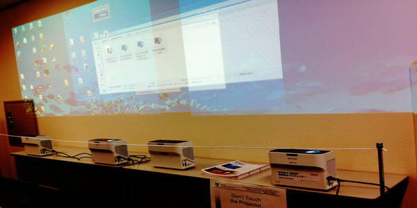 、数台のディスプレイに表示を行っているのかぁ…と感心していると、いつの間にかプロジェクタは4台に増え、そして(無闇に横に長い)Windowsデスクロップ画面が映し出され、調整作業が行われていました(普通に動いている状態では、プロジェクタ間の繋ぎ目が視認されることはありません)。