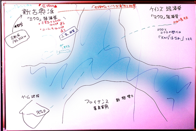 これが、(話を聞きながら)一昨日ホワイトボードに描いてみた「経済学の世界地図」です。ミクロ経済学の大陸の上をウロウロしたりもしている「ゲーム理論というラピュタ島」も描かれていたりします。
