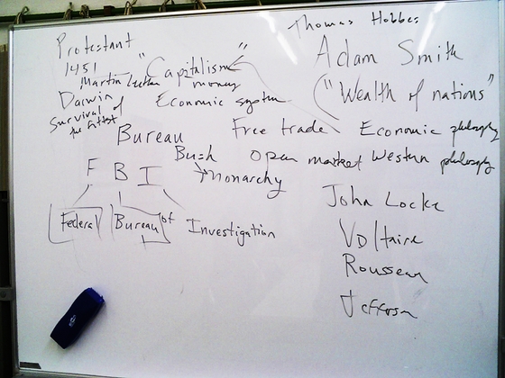 オームビルでOpenCVの講義を受講した後に、三島で「経済学の歴史」を若いアメリカ人に聞いてみた。サラサラと、年号や人名あるいは署名をホワイトボードに書いてもらいながら、彼の視点から見た話を聞く。過去の人たちが(彼の視点から見て)どのように世界観が違うのか、その過去の人たちが他に文化にどのような影響を与えたのか、そんなことを、他の視点から聞くことができるのが、何より一番面白い。