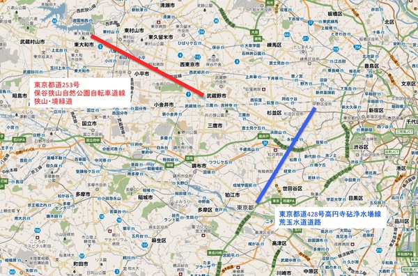 東京都道428号高円寺砧浄水場線ー荒玉水道道路ーは、多摩川沿いにある世田谷区砧浄水場から杉並区高円寺まで10km弱の距離をひたすら直線上に走る道です。多摩湖(村山貯水池)から(武蔵境にある)境浄水場までの導水路上に作られた東京都道253号保谷狭山自然公園自転車道線ー狭山・境緑道ーと同じように、東京都道428号高円寺砧浄水場線ー荒玉水道道路ーは多摩川の水を都心に導く導水路上にある道です。