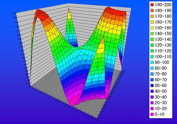 このアプリケーションを使うと、開かれているエクセルの中のチャート(複数のチャートがあれば、一番最初に作成したもの)を、等高面グラフや濃度グラフを、スペクトルカラー風にしてみたり、炎風の色表現にしてみたり、青→赤の色表現にしてみたり、と色々なことができます。…あるいは、Bitmapファイルを適当に作ってやれば、左端がグラフ中の下端の色として扱われ、一番右端の色が上端の色として使われたグラフに変えることができます。つまり、自由自在にチャートの色を簡単にカスタマイズすることができます。しかも、縦軸の最大・最小・分割幅なども設定することができるようになっています。