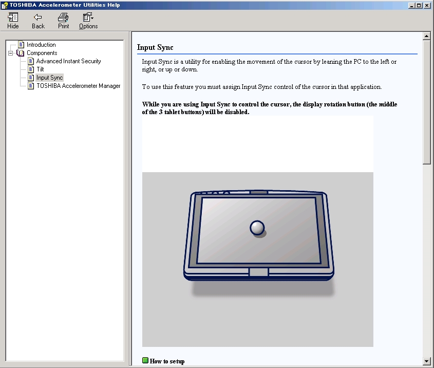 しかし、InputSyncを使った場合には、東芝のTablet PCが搭載する6自由度の加速度センサの値のうち2軸の値しか活用することができないとか、高速度の値取得ができないなどの不都合な点がある。ユーザー・インタフェース用としては、高速度の値取得はできなくても構わないし、最悪2軸入力でも悪くはない。とはいえ、せっかくなのでもう少し調べてみることにする。