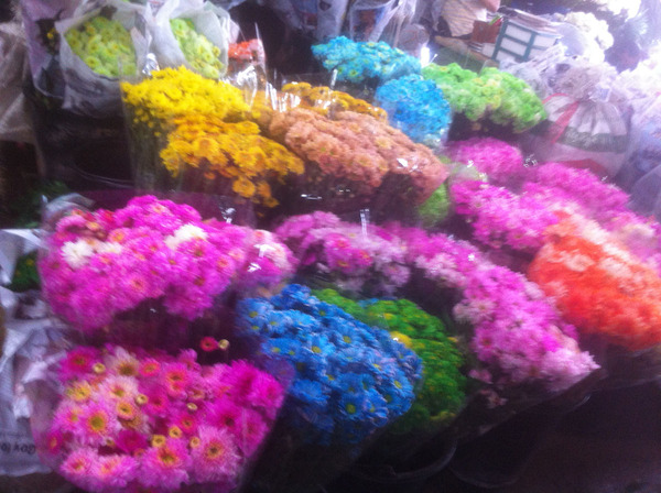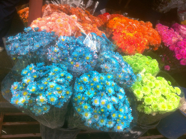 ■花屋に並ぶ「(染料水を吸わせた)色とりどりの花」