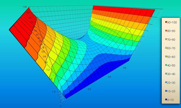 そこで、今回はExcel 2007用の科学技術計算風の等高線グラフ・テンプレート(右上のチャートがその例になります)を作ってみることにしました。…といっても、私が行ったのは(人から頂いた)カスタマイズされた綺麗なグラフが張り付けられているたExcel 2000形式の.xlsファイルをExcel 2007で開き、その後、新しいエクセルブックを作成した後にグラフも含め全コピーし、グラフをさらに適当にカスタマイズした上で、デザイン-テンプレートとして保存するということだけです。つまりは、ただフォーマット変換作業と、手順解説記述、ということになります。