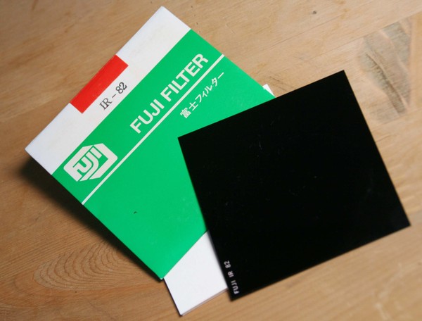 そして、赤外線を撮影することができるようになったそのデジカメのレンズ前に、今度は赤外線だけを通過させる可視光カットフィルタ(右図)を貼り付けてみます。すると、「赤外線だけを撮影できるデジタルカメラ」ができあがります。このデジカメを使えば、「赤外線で見た車のナンバープレート」を撮影することができるわけです。