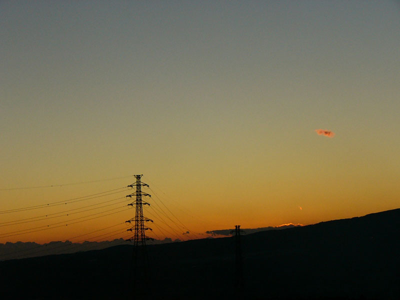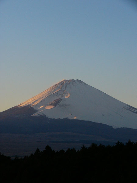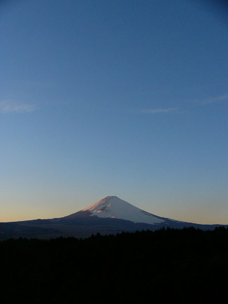 富士山の山頂を眺めてみる。さすがに12倍ズームの望遠だと富士山山頂もオペラグラスで眺めてみるよりもっと大きく見える。そして、もうすぐ夕焼け色になる間際の空を眺めると、こんな感じ。ちょっと濁って見えるのはガラス窓の向こうの景色を撮っているから。