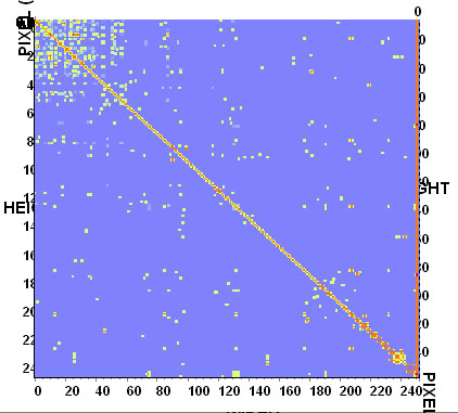 ちなみに、ある種のデータベースというのはハッキリ言ってしまえば公開特許データだったり、そんなソフトを作ったのは某作業中だったり、その某作業中には横でプラグイン作成に興じている某氏がいたりという、何がなんだか判らない状態だったけれど、とりあえずその解析を行う途中で出てくる行列を画像にするとこんな感じ。これはちなみに某E社のここ数年の1000件のデータベースから解析した、某250人の間での相関行列。ちなみにこの中には某一ノ瀬さんもかろうじてはいっています。