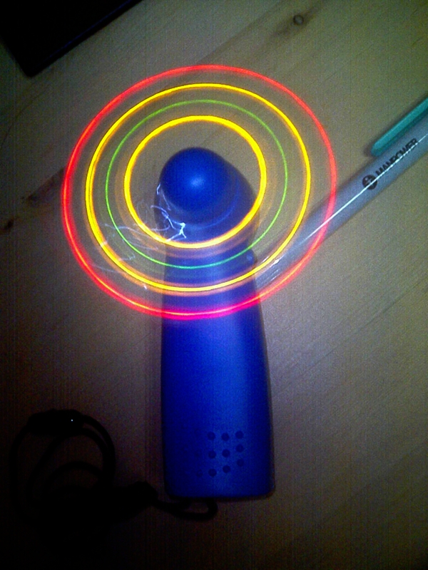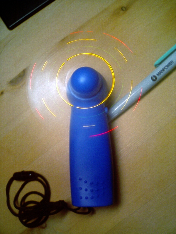 先日、携帯扇風機バーサライタを買った。コンビニなんかでよく見かける小さな持ち歩きようの扇風機のプロペラ部分にLEDが付いているモノである。回転させると、色んなパターンでLEDが点灯し、多種多様なパターンを描き出す。見ていると、自然と楽しくなる。
