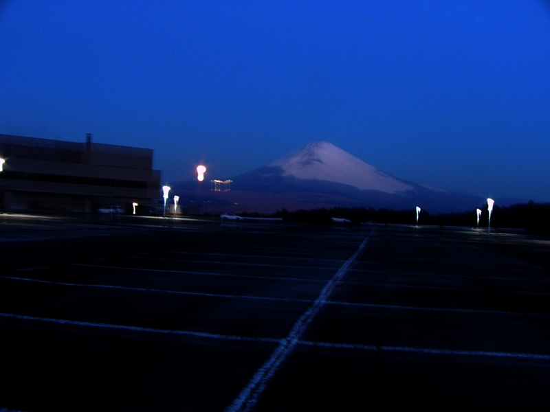 朝6時の駐車場は軽く凍っている。試しにパックをアスファルトの上に置いて、足で蹴ってみると、ずいぶん遠くまで滑っていく。富士山の左手に見える光柱は、みるみる間に沈んでいく朝の月。富士の裾野に見えるVの字は小さなスキー場。ほんの3時間の後に同じような景色を眺め直してみると、そこはまるで別世界。