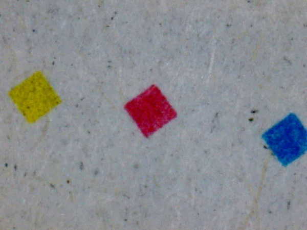 身の回りにある「色んなものを拡大してみよう」と思い、朝日新聞を眺めていると、下隅に色濃度管理用の色パターンが二種印刷してある。大きな方でも1mm角ほどの大きさで、小さな方はさらにその十分の一ほどの大きさだ。つまり、数百ミクロン弱の大きさだ。朝日新聞のカラー広告はFMスクリーンを使っているということなので、この小さな方のパッチはFMスクリーンで使われる最小ドットなのだろうか。