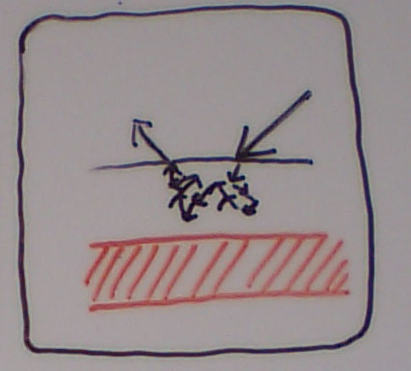 しかし、白い服が水に濡れたときには、状況が異なってくる。水の屈折率が1.3強であるため、繊維と水の間の屈折率差が小さくなり、繊維と空気の間で反射・屈折があまり生じなくなってくる。その結果、照明光が白い服をそのまま通過して、服の下に到達・反射した後に、また白い服を透けて外に出てくる…ということになる。
