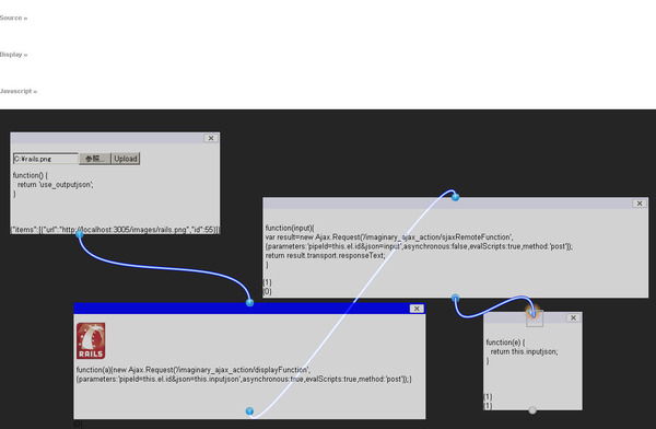 WireIt!を叩き台にして、ImagePipesフォーマットベースの”ビジュアル風”画像処理スクリプトの叩き台を描いてみる。Srcアップロードモジュール・逐次処理モジュール・遅延処理モジュール・表示モジュール…という基本形を描く。