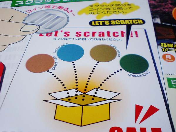 こういった「銀スクラッチ」は、後ろから強い光を中てると「(銀スクラッチの下に隠されている)こたえ」が浮かび上がって見えるものが多い。この小学一年生 四月号のプレゼントクイズの場合も、やはり後ろから光をあてると、答えが透けて見えてくる。右の画像は、きらりん☆レボリューション のイラストを白色LEDで背後から照らすことで、「あたり」と「はずれ」を透かし見た場合である。朱色インクで印刷された「あたり」と藍色インクで印刷された「はずれ」という文字が、やはり浮かび上がって見えることがわかる。