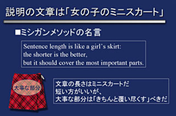 (文の長さは女性のミニ・スカートのようなもので、短ければ短いほど良い。しかし、最も大切な部分はカバーしていなければならない)