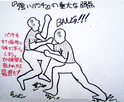 しかし、この「きわめて物理的な強いパンチを打つ方法」には、重大な弱点がある。それは、「パンチを打つ前後には体が浮いてしまっている。そのため、そのパンチを打つ前後の瞬間に攻撃されたら、ひとたまりもなく倒されてしまう(踏ん張ることができない)」ということである。