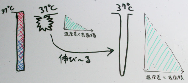 放熱・冷却の効果は、皮膚の表面における"各領域での(皮膚と空気層の)温度差"を表面積にわたって積分したものに比例しそうに思える。また、皮膚内部における伝熱も重要であるに違いない。大雑把にラクガキしてみれば、それは下の図の「緑色の面積が大きいほど放熱・冷却効果が大きい」というイメージになる。
