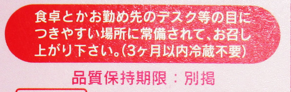 食卓とかお勤め先のデスク等の目のつきやすい場所に常備されて、お召し上がり下さい。このパッケージを「目のつきやすい場所に常備する」のは、ちょっと気恥ずかしい。それに、「老若男女を問わずバストの美容」というあたりも少し首をひねってしまう。けれど、健康維持の役に立つのなら飲んでみようか…ちょっとコワイけれど。