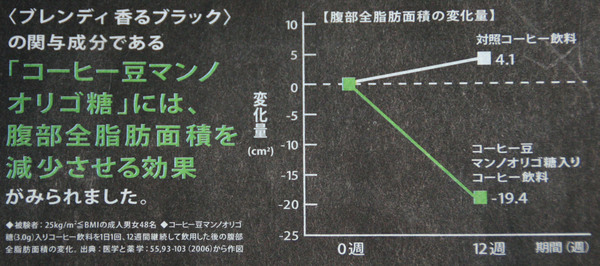 ……とはいえ、脂肪厚みが2mm弱減少する、つまり、ベルトの穴で一つ細くなる、というのは(それが本当であれば)結構魅力的である。一体、香るブラック ブレンディの「コーヒー豆マンノオリゴ糖」のちからが示す「腹部全脂肪面積」は何を示しているのだろうか。