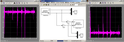 PCのマイク入力から環境音を取得して、その逆位相の音をスピーカーから出力したら、PCのごく近くの領域だけは、ノイズ=ゼロの理想的な作業環境が生じるのではないだろうか?というわけで、アクティブ・ノイズ・キャンセリング PC を作ってみました。やったことはとても簡単、SimuLinkを使って、サウンド入力の逆位相の音をスピーカーから出力するモデルを作ってみたわけです。一言で書けば、サウンド入力×-1の音声をサウンド出力するだけのモデルです。