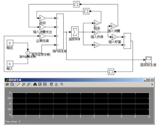 「Simulinkで経済循環モデルを作ってみる」の続きで、マクロ経済学の経済循環モデルを教科書を読みながら、同時にSimulinkでそのモデルを作り確認しつつ、自習しているのですが、「わかった気になるのと、わかるのは大違い」ということだけは実感できます。教科書に書いてあることを、自分できちんとなぞることがなかなかできません。