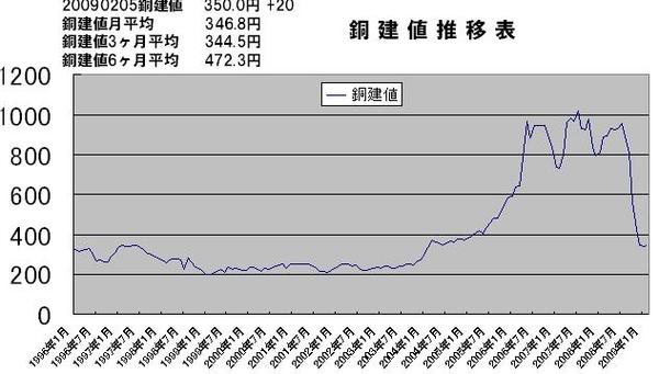 ここ数日は、銅は300円/kgくらいで推移している。1~2年くらい前のプチバブルの時代には、1000円/kgほどであったが、今はそれ以前と同じ程度の価格水準(300円/kgほど)に戻っている。