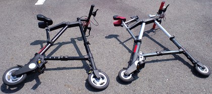 純正品とパッチモン8インチ空気タイヤ版のデザインは全くといってよいほどに同じに見える。とはいえ、やはり純正品の方が純正品がゆえに綺麗で格好良く見える。右上や下の写真で、右側が純正A-bikeで、左側がパッチモン「8インチ空気タイヤ版 A-bicycle」である(フレームの色が違うのは、パッチモンには何種類も色があり、私がブラックを買ったからというだけである)。