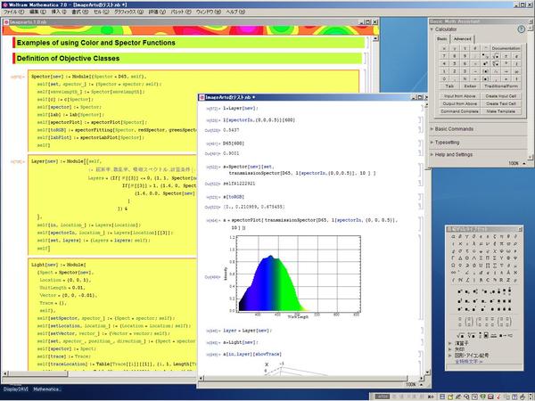 a=Light[new][setSpector, D65][spector][600]というように記述をすることができます。これは、スペクトル属性を持つ「光オブジェクト」をつくり、そのスペクトルをD65光源と同じにし、そのスペクトルの600nm波長の強度をaに代入する、という内容です。最初の例のような、括弧で多重に囲われているのではなく、括弧が連続しているので、括弧の対応や処理手順がわかりやすくなっています。