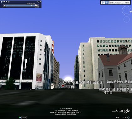 ・・・と聞けば、そんな景色を眺めてみたくなることと思います。そこで、Google Earthで京都四条河原町の交差点に行き、太陽を表示するモードにして、今年の秋分の日、午後5時40分に時空間トリップしてみました(Google Earthを特定の時間・場所・向きを指定して起動できる”リンク”があれば、そんな”リンク”を挿入したいところです)。それが、下の映像です。東西に走る四条通りの先の山上に、太陽が沈んでいくさまを見ることができます。こんな幻想的な風景は、液晶ディスプレイの中に見るだけでも、とても魅力的な景色です。