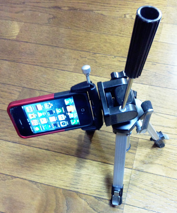 微速度動画を撮影するために、上海問屋の「携帯電話用 三脚固定ホルダー DN-100CC」を買いました。携帯電話やiPhoneなどを三脚に固定するためのミニ万力です。その構造は、あくまで単なるミニな万力に過ぎません。だから、万力が掴むことができるものであれば、どんなものでも三脚に固定することができます。