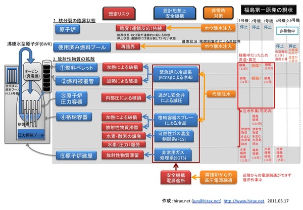 福島第一原発の1・2・3・4号機を「それぞれどのようなシークエンスで収束させようとしてるのか」「どんなリスクがあって、どんな対策が講じられているのか」「最悪の場合には、どんな可能性が考えられるのか」といったことについて全く説明されていないように思う。インターネット上で探してみても、そういった情報が見当たらない。説明不足のことばかりだ。というわけで、「ないなら作れ」の精神で資料を作れ。