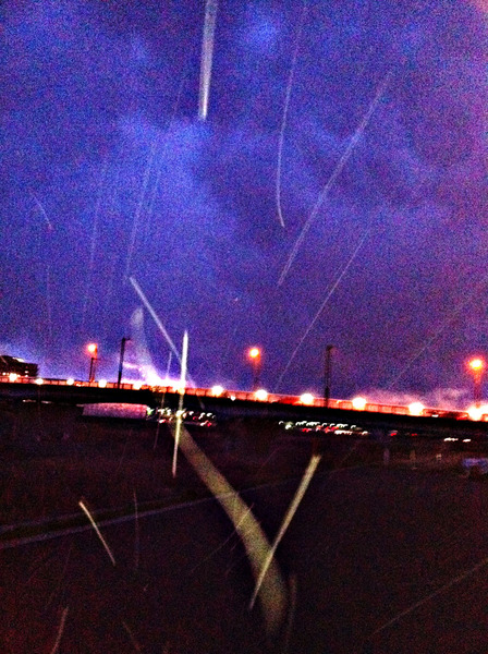 雲のシッポの中は「吹雪」でした。雲のシッポに向かって走っていた時には、風は強いけれど、頭上には蒼空がのぞく夕暮れだったのに、シッポの中に入ったと思った瞬間、たくさんの雪がうずまく風とともに四方八方から降り注いでいたのです。雲のシッポに入った瞬間、周りの街の灯りが、吹雪(ふぶき)の向こうに霞んでしまいました。右の写真は、「私が入ってみた雲のシッポ」が通り過ぎ・走り去ってしまおうとする瞬間に撮った写真です。