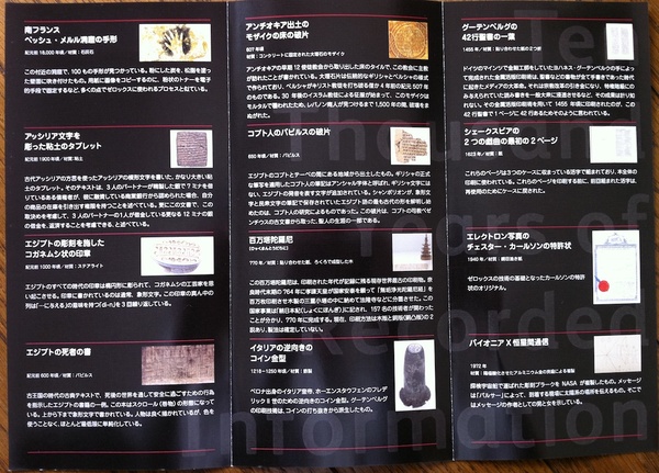 この資料は人類があらゆる時代や地域を通じて様々な媒体に記録してきた情報を展示し、人類の記録の足跡を表現しています。